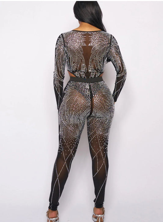 BLACK WOMEN'S LONG SLEEVE BODYSUIT & ELASTIC WAIST PANTS MESH STUDS 3PC. SET BCCBPS24077